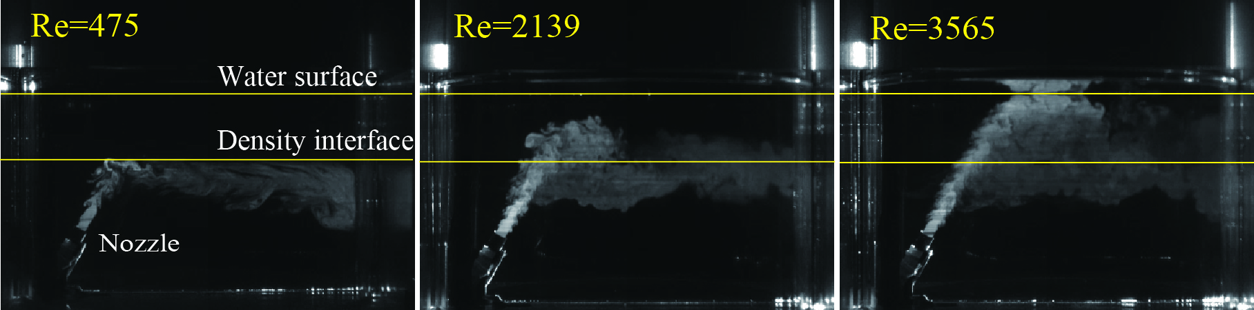 密度界面に対する噴流の相対的な運動および混合は,Reに応じて定まることが判りました.